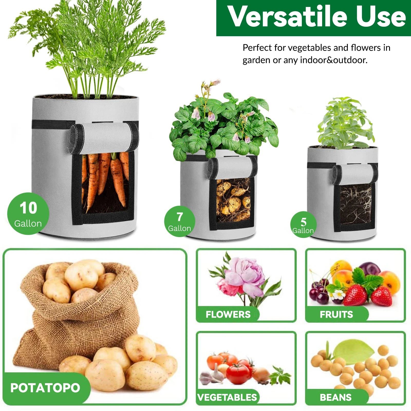 【Wide Application 】 Our potato grow bag can not only be used to grow flowers, vegetables, fruits, and other plants, but also can be used as a storage bag, such as putting dirty clothes, tidying up tools, and pet beds.